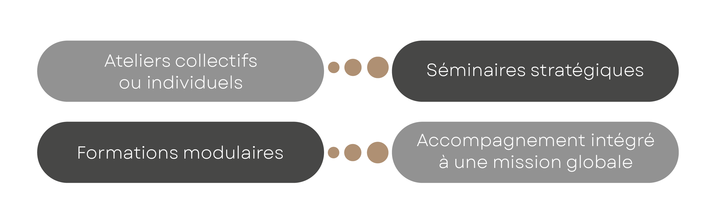 Chaque intervention est conçue sur mesure selon le niveau de maturité et les enjeux spécifiques.
